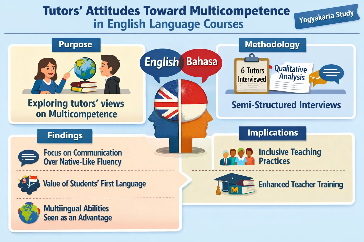 Methodology – This study employed a qualitative descriptive research design. Six English tutors from an English course institution in Yogyakarta were selected using purposive sampling. Data were collected through semi-structured interviews to explore tutors’ perceptions of multicompetence. The analysis followed three stages: familiarization with the data, coding, and interpretation. The interview transcripts were analyzed thematically to identify patterns related to teaching perspectives and the use of learners’ first language.